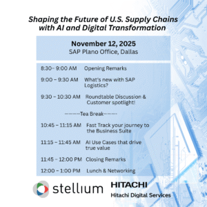 The roundtable convenes experts from Stellium, Hitachi and SAP and U.S. supply chain stakeholders for a focused half-day exchange on how AI and digital transformation are reshaping logistics, manufacturing. With sessions covering SAP’s latest logistics updates, customer insights, and fast-tracked Business Suite adoption, the event offers practical strategies for building resilient, intelligent supply chains.